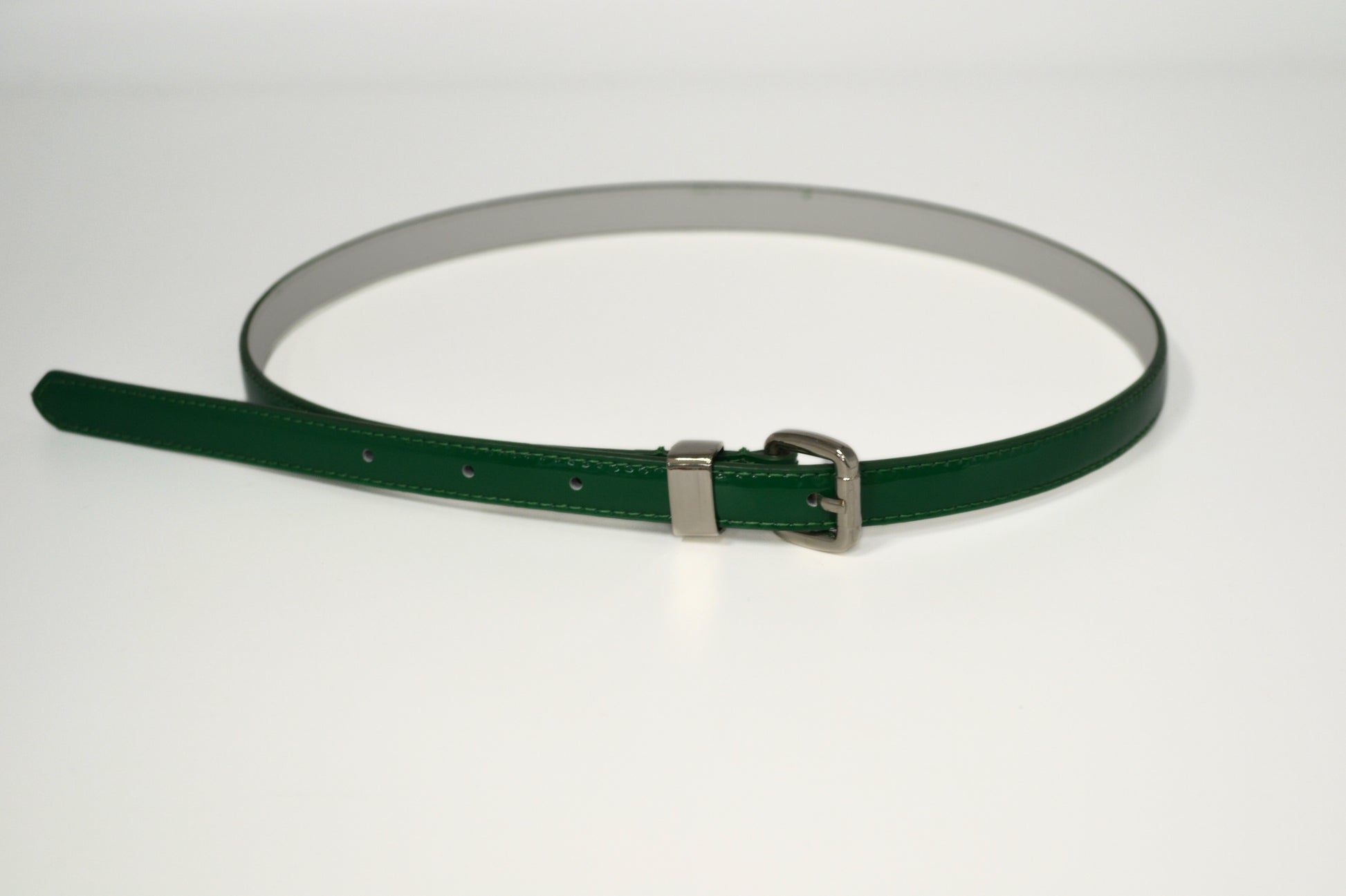 CARRIE - Womens Dark Forest Green Patent Skinny Leather Belt with Silver Buckle