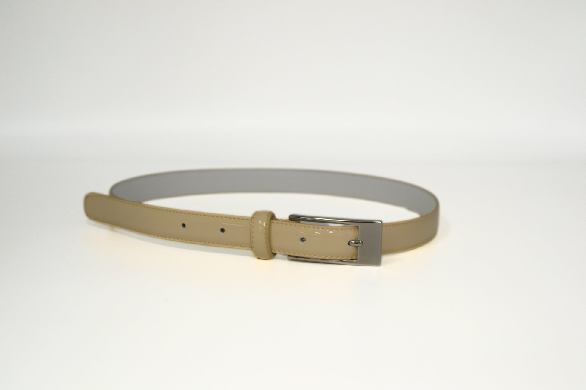 Stylish genuine leather skinny belt. A day to night versatile patent nude with matching stitched edge detail. Featuring a polished silver buckle.